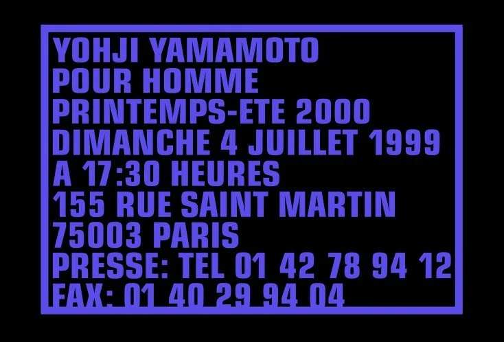 YOHJI YAMAMOTO POUR HOMME PRINTEMPS-ETE 2000 DIMANCHE 4 JUILLET 1999 A 17:30 HEURES 155 RUE SAINT MARTIN 75003 PARIS PRESSE: TEL 01 42 78 94 12 FAX: 01 40 29 94 04